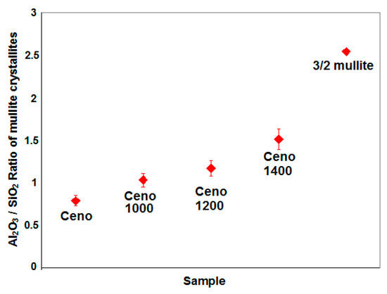 It was found that the Al2O3/SiO2 weight ratio in the mullite crystallites increased from 0.8 to 1.1 when the cenospheres were heated to 1000 °C. This is in good agreement with the literature by Gerardin [17], where it was reported that mullitization, spinel formation and silica segregation could occur simultaneously leading to the exothermic transformation around 980 °C of an amorphous phase into a partially crystalline material. The Al2O3/SiO2 weight ratio in the mullite crystallites further increased to 1.5 when the cenospheres were heated at 1400 °C, this ratio gradually approached the value of 2.5 of a stable stoichiometric 3/2-mullite (3Al2O3·2SiO2, 71.8 wt.% Al2O3).
