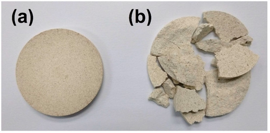 As mentioned earlier, cenospheres were thermally unstable as a result of the continuous phase evolution. Because of this thermal property, non-heat-treated cenospheres may not be suitable for being used as a pore-forming agent in ceramics unless a heat treatment is applied. A small study on the effect of using heat-treated and non-heat-treated cenospheres as a pore-forming agent in ceramic was conducted to validate the claim. In the study, 30 wt.% of non-heat-treated cenospheres and 1100 °C-sintered cenospheres were mixed together with 70 wt.% of kaolin powder (Al2Si2O5(OH)4, Sigma-Aldrich), respectively. The obtained powders were pressed into pellets of 4 cm in diameter under 1443 kg/cm2 compression force. The pellets were then sintered at 1200 °C for 4 h at a heating rate of 10 °C/min, subsequently cooled to room temperature by natural convection inside the furnace. Figure 9 shows the physical appearance of the two sintered pellets. The pellet obtained from 1100 °C-sintered cenospheres retains its pre-sintered form, whereas the pellet obtained from non-heat-treated cenospheres was shattered into pieces during the cooling stage. The shattered pieces were far away from each other, showing signs of high internal stress. When non-heat-treated cenospheres were used as a pore-forming agent in ceramics, during the sintering process, cenospheres would react with the ceramic precursor to form a new compound with a different thermal expansion coefficient. The mismatch in thermal expansion coefficient between different compounds in the ceramic, upon temperature variation, generates an internal stress state and this eventually leads to structural failure during cooling.