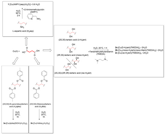 Carboxylic acids represent classical ligands for Werner complexes: As early as 1953, Niekerk et al. investigated the crystal structures of Ni(II) [1], Zn(II) [2] and Cu(II) [3] acetate and established the monohapto, chelating and bridging coordination modes, respectively, for the carboxylato ligand in these solids. Carboxylic acids may also act as bridging building blocks in coordination polymers (CPs) [4]. Among the many potentially attractive properties of CPs, we have focused on their dynamic responses to external stimuli such as temperature [5,6,7,8] or moisture [9,10] in previous publications. In order to be really useful beyond basic research, the constituents of such dynamic materials should show low toxicity. Many carboxylic acids are found in the GRAS list, i.e., among the substances generally recognized as safe, e.g., by the FDA [11]. Carboxylic acids often show good solubility in water, and the chiral pool provides inexpensive and efficient access to a relevant number of enantiopure compounds. Amino acids meet the latter requirement par excellence, and their coordination chemistry has been investigated extensively [12,13,14,15,16,17,18,19,20,21,22,23,24,25,26,27,28,29,30,31,32,33,34,35,36,37,38]. Dicarboxylic acids are even more prone to act as bridging components than their monofunctional congeners and have been frequently employed for the construction of coordination polymers [39,40] and metal-organic frameworks [41]. In this contribution, we introduce six new coordination compounds in which dicarboxylic acids act as terminal ligands or as linkers between divalent Cu cations, and we address the influence of chirality and the effect of blocking ligands on their crystal structures. Figure 1 provides a summary of the reactions and the structurally characterized products.