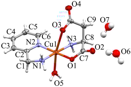The co-crystallized water molecules are situated on twofold crystallographic axes (Wyckoff positions 2a and 2b); refinement of their site occupancies resulted in a stoichiometry of [Cu(AMPY)(asp)(H2O)] · 0.6 H2O, in agreement with the microanalytical data. Additional details concerning the site occupancy are given in Supplementary Materials S1.3.1.