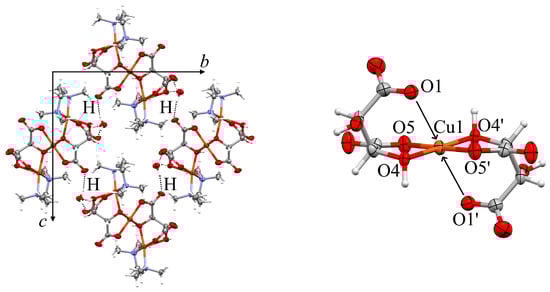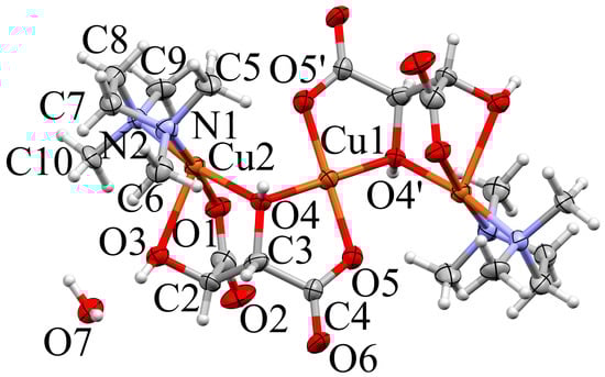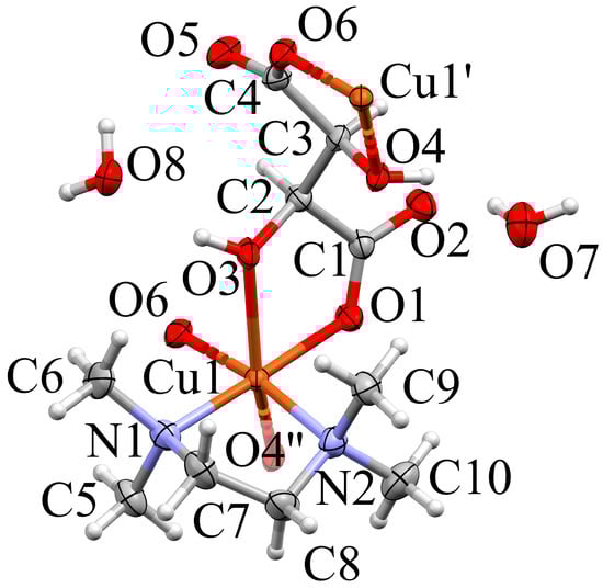 The crystal structure of 2a is made up of one-dimensional [Cu(d-H2tart)(TMEDA)]n strands in [1 0 0] direction (TMEDA = tetramethylethylenediamine; H2tart = tartrate) and co-crystallized water molecules. The asymmetric unit of space group P21 contains a single chain link and is depicted in Figure 3. Its Cu(II) center features an elongated Jahn–Teller octahedron.