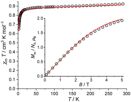 The corresponding data are shown in Figure 7 as vs. T plot at and vs. B plot at . The product and the magnetization M allow to retrieve information about the effective magnetic moment of open-shell cations involved and about their interaction. At , the value of is , which is well within the expected range of two, but not three non-interacting Cu(II) centers ( per Cu(II) center [52]). Upon cooling the compound, the values continuously decrease reaching at , and subsequently drop off to at . Therefore, the vs. T plot reveals an almost spin-like behavior and, due to the drop off at low temperatures at such a small field, a weak antiferromagnetic exchange interaction between the two Cu(II) centers, while the magnetic anisotropy should be rather small. In addition, the molar magnetization as a function of the applied field B at is in agreement with this observation: is linear up to and increases with decreasing slope up to . At this field, the magnetization reaches without being saturated. This value is below the saturation value of about estimated from the value at using per single center. Since additionally the linear part can be observed over a rather wide range at this temperature (about the double of non-interacting centers), the magnetization data suggest an antiferromagnetic exchange interaction between two Cu(II) centers. We use an effective isotropic Hamiltonian () to estimate the magnetic properties of the compound, and consider the deviation from the ideal spin-like system by a temperature independent paramagnetic contribution () to the magnetic susceptibility [52]. The least-squares fit yields the red lines shown in Figure 7 and the parameters per Cu(II) center as well as and . These parameters confirm a weak antiferromagnetic exchange interaction between the two Cu(II) centers with a common g-factor. Therefore, the magnetic data exclude three Cu(II) centers in 2b, and the third copper center has to be of diamagnetic nature, e.g., Cu(I) or low spin Cu(III).