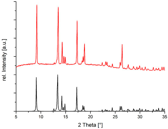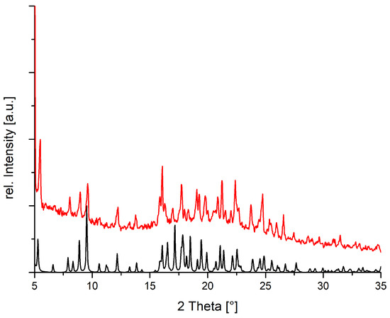 Measured (red) and calculated (black) powder diffraction pattern for compound 3b.