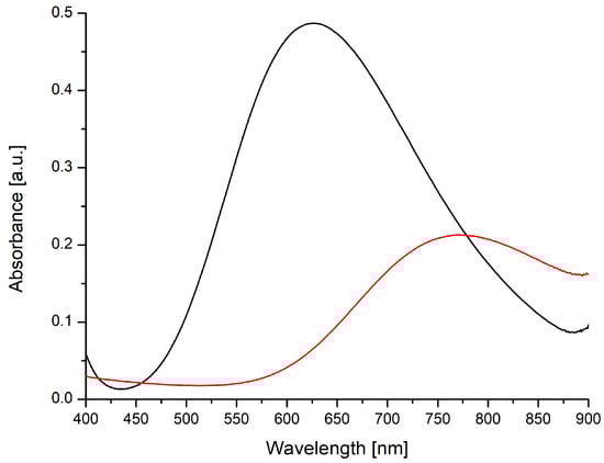 Vis spectra of 3b (black, c = 10 mmol L–1) and copper(II)-acetate (red, c = 1 mmol L–1).