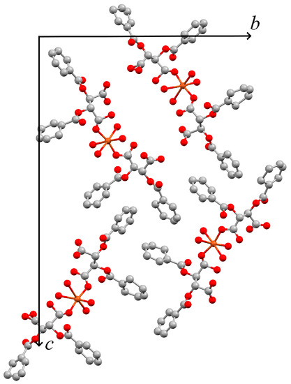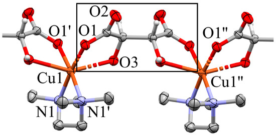 In contrast to the reaction product with enantiopure tartaric acid, the derivative of meso-tartaric acid, 2b, contains discrete, trinuclear complexes with the composition [Cu3(meso-H2tart)(meso-Htart)(TMEDA)2]. Its central Cu cation occupies Wyckoff position 2c, a crystallographic inversion center, in the monoclinic space group P21/n. Figure 5 visualizes the trinuclear complex: the carboxylato oxygen atom O5 and the bridging hydroxy O4 and their symmetry equivalents lead to a necessarily planar and almost regular all-oxygen coordination about Cu1. The peripheral Cu cations interact with the second carboxylato moiety and both hydroxy groups of the tartrate and the N,N chelating TMEDA ligand in an overall distorted square-pyramidal coordination. A comparable tartrate coordination about Cu(II), with carboxylato O in the Jahn–Teller positions, has been found by Hörner and Klüfers [51]. Additional contacts occur between the Cu cations and significantly more distant O atoms; not only the interatomic separations of 3 Å but also the angles subtended at the transition metal allow to exclude them from the coordination sphere (Figure 6).