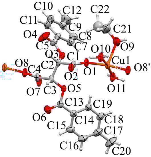 The crystal structure of 2c contains one-dimensional [Cu(rac-H2tart)(TMEDA)]n strands in [1 0 0] direction and co-crystallized water molecules. A section of a single chain is depicted in Figure 10: Both the Cu(II) cation and the midpoint of the C2–C2 bond in the tartrate anion are located on two-fold crystallographic axes, and hence each polymer strand is homochiral. Crystallographic inversion in the orthorhombic space group Pccn necessarily implies an overall racemic structure, with neighboring strands of opposite chirality.