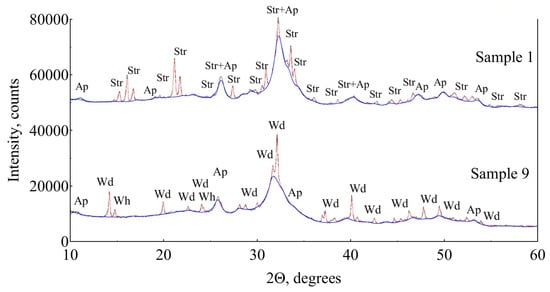 XRD patterns of the pure phosphate (sample 1) and oxalate-bearing (sample 9) kidney stones (red lines). The blue lines indicate the contribution of apatite in each XRD pattern (calculated by the Pawley method). Wh—whewellite, Wd—weddellite, Ap—apatite, Str—struvite.