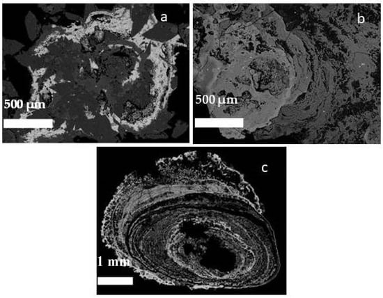 SEM BSE images of the oxalate-bearing stones, Sample 5 (a) and the pure phosphate stones, Sample 1 (b) and Sample 17 (c).