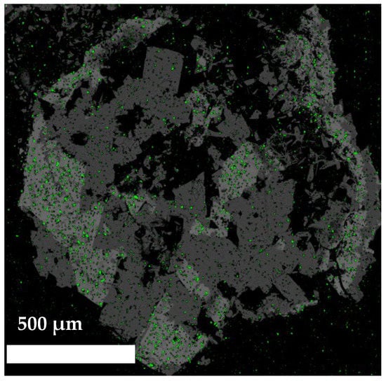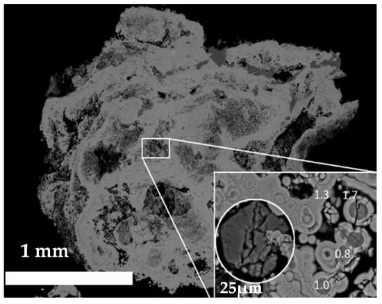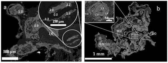It is known that kidney stones are divided into two types according to their structural and textural features: stones of crystallization and agglomeration types [4]. According to SEM studies, the studied oxalate kidney stones, which consist of whewellite and weddellite, are characterized mainly by crystallization structures (Figure 2a, Figure 3 and Figure 4), with spherulitic zonal structures (Figure 4), and dendritic structures composed of individual weddellite crystals (Figure 2a and Figure 3). Phosphate kidney stones studied herein are related to the agglomeration type of structures [24]. The structure of phosphate uroliths is fine grained or, more often, cryptocrystalline, which indicates the formation of stone by the agglomeration of microcrystalline or amorphous material (Figure 2b,c and Figure 5). Concentric zoning is characteristic for most urinary stones (Figure 2, Figure 4 and Figure 5). Minerals form subsequent layers clearly visible in SEM images. Phosphate minerals do not form distinctive crystals, while oxalates form bipyramidal crystals with sharp edges (weddellite) or do not form visible edges (whewellite). In addition, kidney stones can be characterized by the different contents of organic matter.