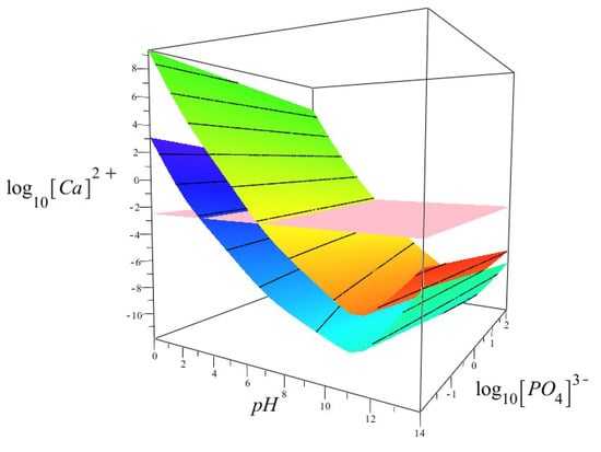 Solubility diagrams for the fluorapatite (lower) and hydroxylapatite (upper); the pink plane shows the average concentration of Ca2+ ions in the physiological solution.