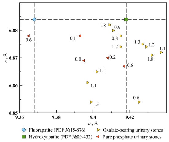 The range of apatite unit cells parameters from the studied kidney stones (Table 3) was in good agreement with the previously estimated values (a = 9.395(4)–9.457(4) Å, c = 6.849(3)–6.885(4) Å (Figure 7) [15], revealing the diversity of their chemical composition and the significant variations in its formation conditions. It is known that the apatite of urinary stones is a Ca-deficient H2O-bearing carbonated hydroxylapatite of the B-type [15,25]. The increase of the a unit cell parameter comparing to the stoichiometric hydroxylapatite (a = 9.418, c = 6.884 Å JCPDS № 9-432) mainly occurs due to the substitution of OH− ions by H2O molecules in the channels of the structure, whereas the reduction of the parameter occurs due to the (CO3)2− for (PO4)3− ion substitution and the OH− for F− ions. The reduction of the c unit cell parameter lower than that for the stoichiometric hydroxylapatite indicates that the effect of the vacancies at the Ca sites was significantly larger than in the (CO3)2− for (PO4)3− substitution.