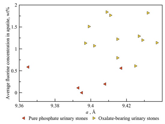 There was no direct correlation between the fluorine content in the studied apatites and the value of the a unit cell parameter (Figure 8), but at the level of a tendency we saw that the fluorine content increased with the increase of the a parameter. The observed increase of a unit cell parameter with the increase of fluorine content could be caused by multiple substitution mechanisms that affect unit cell parameters in different ways, since kidney stones are formed in multicomponent solutions that contain different cations and anions, which leads to different variations of the unit cell parameters. For instance, since we assume that the formation of fluorine-bearing apatite occurs in solutions with an acidic pH value, one of the most likely mechanisms is the increase in the H2O content in the structure of apatite, which in turn significantly increases a unit cell parameter [15].