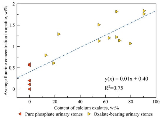 Direct correlation between the amount of oxalate mineral phases (wt%) and the fluorine content (wt%) in the stone.