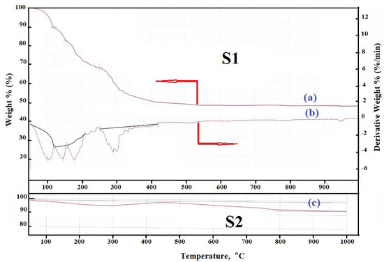 Thermal analysis of the prepared samples; (a) TG of S1, (b) DTG of S1 and (c) TG of S2.