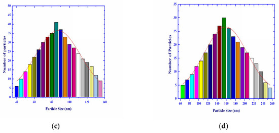 Histograms of particle size distribution based on SEM micrographs images for the prepared samples; (a) S1, (b) S2, (c) S3 and (d) S4 samples.
