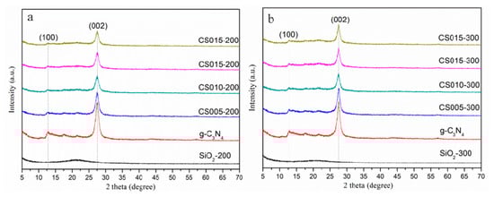 The XRD patterns of SiO2-200, g-C3N4, CS005-200, CS010-200, CS015-200, CS020-200 (a) and SiO2-300, g-C3N4, CS005-300, CS010-300, CS015-300, CS020-300 (b).