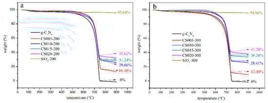 The TGA analysis of SiO2-200, g-C3N4, CS005-200, CS010-200, CS015-200, CS020-200 (a) and SiO2-300, g-C3N4, CS005-300, CS010-300, CS015-300, CS020-300 (b).