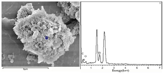 As shown in Figure 3, the structure of CS005-200 is a stacked layer. The spacing between the slices is very obvious; there are holes in the middle of the block. At the same time, there are a few spherical SiO2 particles in the middle of the block, which are attached to both sides of the part of the plate. Obviously, more spherical SiO2 particles were observed in CS010-200 than in CS005-200. The degree of stacking between the sheets becomes weak. The form is developed into a three-dimensional structure. There are more g-C3N4 flakes in the sample than spherical SiO2 particles, which leads to uneven distribution. The spherical SiO2 particles in CS015-200 are evenly embedded in the holes of the g-C3N4 sheet. In CS020-300, spherical SiO2 increased significantly, while g-C3N4 flakes decreased. The distribution of SiO2 and g-C3N4 is also uneven. As the SiO2 content increases, more SiO2 particles are introduced into the pores of the g-C3N4 flake. When the added amount reached 0.15 g, the SiO2 particles evenly entered the pores of the g-C3N4. At this time, the modification effect is the best. The amount of SiO2 continued to increase, and SiO2 was distributed on the surface. Moreover, the porosity in the sample is also reduced, which leads to a poor modification effect. The SEM changes of CS005-300, CS010-300, CS015-300, and CS020-300 are similar to those of the CS200 series. It should be noted that the holes in the CS300 series samples are smaller than those in the CS200 series. The increase in porosity will increase the specific surface area, thereby improving the photocatalytic activity. Therefore, when the specific surface area of SiO2 is 300 m2/g SiO2 and the addition amount is 0.15 g, the obtained g-C3N4-SiO2 has the best performance. The results of the EDS analysis are shown in Figure 4. CS015-300 contains four elements of C, N, Si, and O. Both C and N come from g-C3N4, while Si and O come from SiO2. This indicates that g-C3N4-SiO2 has been successfully synthesized.
