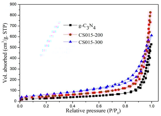 N2 adsorption-desorption isotherms of g-C3N4, CS015-200, and CS015-300.