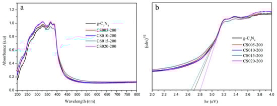 UV–Vis spectra (a) and band gap (b) of g-C3N4, CS005-200, CS010-200, CS015-200, CS020-200.