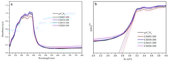 UV–Vis spectra (a) and band gap (b) of g-C3N4, CS005-300, CS010-300, CS015-300, CS020-300.