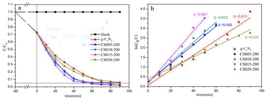 As shown in Figure 8a, RhB is not degraded without adding a catalyst. After 1 h of dark treatment, g-C3N4 has the same dye adsorption rate as the other four samples, which is about 27%. With the extension of visible light exposure time, the absorbance of the dye is gradually reduced, and the dye is continuously degraded. The minimum degradation time of CS015-200 is 55 min. Secondly, the degradation time of CS005-200 is 60 min. Thirdly, the degradation time of CS010-200 is 70 min. Fourthly, the degradation time of g-C3N4 is 75 min. The maximum degradation time of CS020-200 is 90 min. The catalytic performance from strong to weak is ranked as CS015-200, CS005-200, CS010-200, g-C3N4, CS020-200. The reason for the reduced efficiency of CS020-200 may be related to the reduced visible light absorption range caused by the reduction of the absorption edge. Among all the samples, the improvement of the CS015-200 is the most obvious, and the performance has improved by 26.67% compared with the g-C3N4.