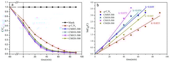 As shown in Figure 9a, after 1 h of dark treatment, different samples have different adsorption rates for dyes. The adsorption rate of composite materials is higher than that of the single g-C3N4, and the adsorption rate of g-C3N4 is about 27%. The adsorption rate of CS010-300 and CS020-300 is about 33%. The adsorption rate of CS005-300 and CS015-300 is about 39%. The minimum degradation time of CS015-300 is 50 min. Secondly, the degradation time of CS005-300 and CS010-300 is 60 min. Thirdly, the degradation time of CS0020-300 is 70 min. The maximum degradation time of g-C3N4 is 75 min. The catalytic performance from strong to weak is ranked as CS015-300, CS005-300 (CS010-300), CS0020-300, g-C3N4. Compared with g-C3N4, the visible light catalytic ability of each sample has improved. This shows that the visible light catalytic ability of the sample is increased with the addition of SiO2 with a specific surface area of 300 m2/g.
