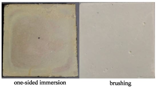 As can be seen from Figure 10, the catalyst distribution on the surface of the cement material treated by the one-sided immersion method is uneven, and the thickness of the coating is different. The color in the middle of the sample is obviously lighter than the color at the edge of the sample. This shows that there are more catalysts on the cement edge than in the middle. Cracking and shedding of the coating appear on the edge of the cement block. The reason is that the solution was dripping onto the cement surface, and the liquid level is affected by the surface tension; it appears to be high in the surroundings and low in the middle []. As the water evaporated, the water in the middle disappeared firstly and then gradually spread to the surroundings. This caused the surrounding coating to be too thick, which caused cracking and shedding. The color distribution of the surface of the cement material treated was relatively uniform by the brushing method, which indicates that the distribution of the catalyst was relatively uniform. There is no cracking and shedding of the catalyst on the cement surface, which indicates that the catalyst did not appear on the cement surface. The reason is that the brush dipped in less solution during the application process, and when applied to the cement surface, the surface tension is less affected. At the same time, the catalyst is further uniformly dispersed in the process of the repeated three times of brushing, thereby avoiding cracking and shedding caused by the aggregation of the catalyst.