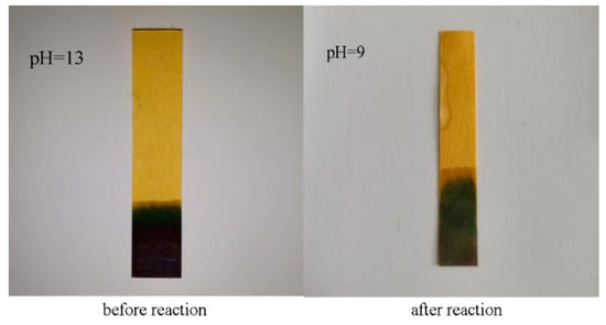 As can be seen from Figure 13, after adding CS015-300 to the saturated calcium hydroxide solution, the pH value of the test mixed solution is 13. After 7 days of reaction, the pH of the solution was reduced to 9. This indicates that the content of OH- in the solution was reduced, and a part of calcium hydroxide was reacted because SiO2 can react with calcium hydroxide by pozzolanic reaction []. According to existing research, it has been found that the product is C-S-H gel after the reaction [,]. We think that the nanosilica in CS015-300 reacted with the calcium hydroxide in the solution to form C-S-H, and the calcium hydroxide was consumed.
