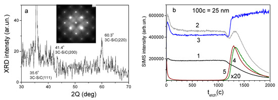 The component distributions across the 3C-SiC/Si structures were studied by secondary ion mass spectrometry (SIMS). The typical SIMS profiles are shown in Figure 2b. The thickness of the homogeneous silicon carbide layer was determined from the carbon (12C) or silicon carbide (SiC) concentration declination and from the silicon (28Si) concentration growth in the SIMS spectra. Carbon atoms diffuse into the silicon substrate for the length more than 3C-SiC layer thickness, forming an intermediate Si1−yCy solid solution layer between the 3C-SiC film and Si substrate. Figure 2b shows also the distributions of oxygen (16O) and germanium (74Ge) in one of the 3C-SiC/Si structures grown with the use of the germane source. The maximum concentrations of oxygen and germanium atoms were observed in the structure under the carbide layer, which is likely an effect of poorer solubility of oxygen and germanium in the silicon carbide. During SiC layer growing, oxygen and germanium atoms are displacing into the Si substrate forming under the 3C-SiC film an Si1−xCx:Ge sublayer enriched by oxygen. The appearance of oxygen atoms with the formation of SiO2 inclusions in the growing carbide layer alongside with nitrogen atoms can be explained by the presence of a high level of residual atmospheric gases in a reactor of a used setup. The observed accumulation of oxygen near the heterointerface (curve 5 on Figure 2b) is due to the effect of oxygen removal from the 3C-SiC layer at the stage of the surface carbonization of a silicon plate. The concentration of hydrogen in the layers remains lower than the oxygen concentration, so no complete passivation of broken oxygen bonds takes place in the structure.