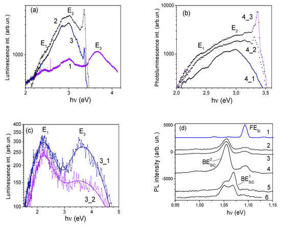 The most interest in the literature has been expressed in the study of the ultraviolet photoluminescence of silicon carbide films in the energy range hν ≈ 2.8–3.0 eV. The photoluminescence observed in silicon carbide layers containing nanostructured elements in this spectral range also has a significant intensity at room temperature, which is of great practical interest. The emission in the optical region in the vicinity of 3 eV was observed for porous silicon carbide films [24,25] and silicon carbide layers with a nanocrystalline structure [27,28,29]. Similar spectra were recorded by us at room temperature upon excitation of the electronic subsystem of the structure with the other methods: with a third harmonic λexcit = 266 nm (4.66 eV) of the femtosecond titanium–sapphire laser (curve 1, Figure 3a) and with a Helium (He) beam from a scanning ion microscope (Figure 3c). The 3C-SiC layer (1) with the thickness ~2.5 mm was grown on Si(111) substrate from hexane (PC6H14 ~0.03 mTorr) at temperature Tgr ~900 °C. The spectra 2(3) were measured for the 3C-SiC/Si(100) structures grown at temperature Tgr ~900 (600) °C with the gas pressure PC6H14 ~0.03 (1) mTorr, PSiH4 = 0.005(0.3) mTorr, PGeH4 = 0.003(0.3) mTorr in a growth chamber, accordingly.