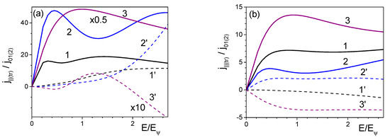 Dependences longitudinal j|| (curves 1–3) and transversal jtr (curves 1′–3′) current components on electric field E/Eψ in a direction angularly (a) ψ = π/4.5 (1,1′), π/6.5 (2,2′), π/10 (3,3′) to the field direction for parameter values are equal: Δ1 = Δ2 = 5 meV (curves 1,1′), Δ1 = 2 meV, Δ2 = 10 meV (curves 2,2′), Δ1 = 10 meV, Δ2 = 5 meV (curves 3,3′), d2/d1 = 2, kBT = 7 meV, Δ11 = Δ12 = 1; (b) ψ = π/10, d2/d1 = 2.7, Δ1 = Δ2 = 5 meV, kBT = 20 meV, Δ11 = 1, Δ12 = 1 (curves 1,1′), Δ11 = 1, Δ12 = 10 (curves 2,2′), Δ11 = 10, Δ12 = 1 (curves 3,3′), δ0 = 1.