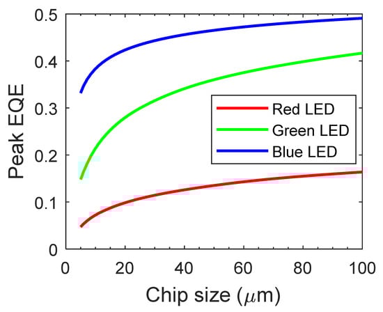 - Konoplev, S.S.; Bulashevich, K.A.; Karpov, S.Y. From large-size to micro-LEDs: Scaling trends revealed by modeling. Phys. Status Solidi A 2018, 215, 1700508. [Google Scholar] [CrossRef]
