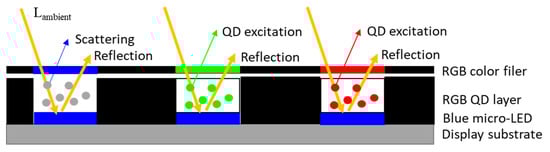 - Lin, H.Y.; Sher, C.W.; Hsieh, D.H.; Chen, X.Y.; Chen, H.M.P.; Chen, T.M.; Lau, K.M.; Chen, C.H.; Lin, C.C.; Kuo, H.C. Optical cross-talk reduction in a quantum-dot-based full-color micro-light-emitting-diode display by a lithographic-fabricated photoresist mold. Photonics Res. 2017, 5, 411–416. [Google Scholar] [CrossRef]