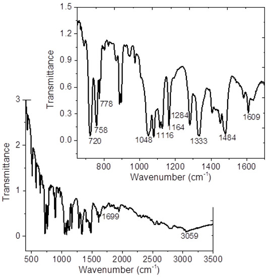 IR-spectrum of the MgPc-MTPDA is shown in Figure 3 and Table 1 summarized the vibration modes and their respective wavenumbers for molecule under study. The band responsible for stretch vibration in-plane pyrrole in the MgPc ring is observed at around 1332 cm−1 and the bands located at approximately 1291, 1165, 1118, and 752 cm−1 result from the interaction of carbon with hydrogen atoms [22]. In addition, the bands observed around 1606 and 1483 cm–1 results from a C=C stretching mode [34,35,36]. For MTPDA, the value around 3060 cm−1 correspond to the vibration of the O-H bond of the carboxylic acid C(O)O-H and it is possible to observe the band corresponding to the carbonyls of the two carboxylic acids at 1699 cm−1 (C=O) [17,25]. Due to the presence of the O-H vibration of the dienedioic acid, it is not possible to evaluate the presence of hydrogen bonds between the MgPc and the MTPDA. Moreover, the crystalline structure of the MgPc is another variant that can be monitored by IR spectroscopy. MPcs are known to have different polymorphs forms which are identified by the IR absorption technique [35,37,38,39,40]. It has been reported that the α-form of MgPc is characterized by a band around 720 cm−1, while the β-form is characterized by a band around 778 cm−1 [35,37,38,39,40]. In the IR spectrum of Figure 3, it is important to notice that the signals related to the two crystalline structures are observed. Additionally, MgPc-MTPDA thin film was also evaluated by IR spectroscopy and the results are shown in Table 1. The signals agree with those reported in the literature, and with those obtained for the crystals. The above indicates a MgPc-MTPDA thermal stability and its possibility of being used as an integral part of optoelectronic devices.