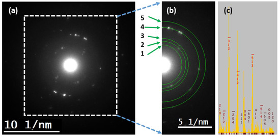 Analyzed (a) SAED pattern, (b) rings considered for measurements on the SAED pattern, (c) Simulated pattern using the java version of the electron microscopy simulation software package (JEMS).