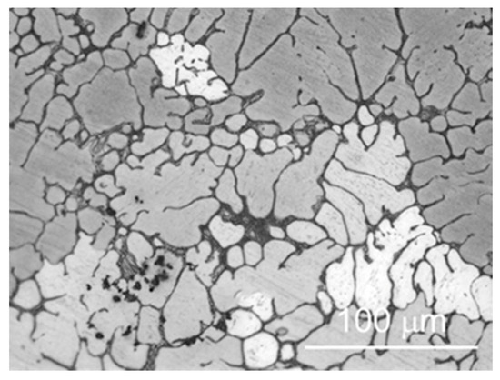 The light micrograph of the as-cast sample microstructure is shown in Figure 2. The α-Mg grains and continuous network of the intermetallic compounds in the dendritic structure (due to the low solubility of the Ca in the α-Mg-Al solid solution) are typical features of the microstructure. The chemical analysis showed that the second phase particles are Al2Ca eutectics. The dendritic branches were broken during the squeeze cast process, as can be seen in the SEM micrograph presented in Figure 3.