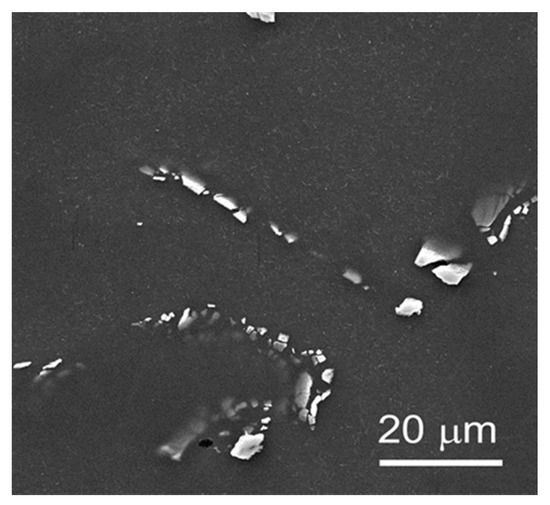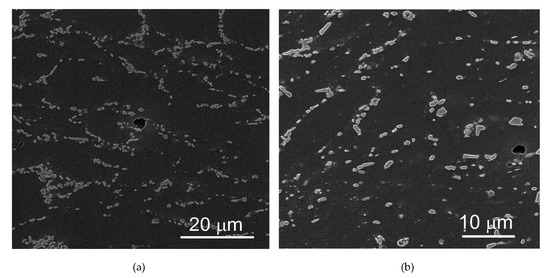 The light micrographs of the samples processed by 1, 2, 4, and 8 ECAP passes are shown in Figure 4a–h. The micrographs in the left column were taken from the perpendicular section (P) to the processing direction, while the micrographs in the right column were taken from the longitudinal (L) section. The microstructure was highly inhomogeneous after the first pass; new small grains were formed inside the former ones. After two passes, the bimodal grain size distribution was formed due to the partial recrystallization. Distinctive twins appeared in the coarser grains in both the 1P and 2P samples (Figure 4b: 1P_L, Figure 4d: 2P_L). The second phase of the net-like distribution was partially disintegrated. A high area fraction of small grains was observed after four passes (Figure 4e,f) and the continuous network of the second phase particles was destroyed; the disintegrated particles were arranged in rows oriented along the processing direction. After eight passes (Figure 4g,h), the grain structure was nearly uniform and the tiny second phase particles were arranged in rows parallel to the processing direction. The scanning electron micrograph (SEM) images presented in Figure 5a,b showed that the morphology of the second phase after eight passes through the ECAP changed. The amount of the Al2Ca phase was not affected by the processing, because its amount was set by the phase diagram. A high degree of fragmentation and some degree of spheroidization did occur, but the secondary phase did not dissolve into the matrix at the temperature used for the processing. The initial size of the particles was up to 10 μm, which is shown in Figure 3, and their distribution is highly limited to the dendritic branches, as shown in Figure 2. The processing obviously led to a decrease in the particle size, as shown in Figure 5. The size of the particles became much smaller (~1 μm). This can be primarily attributed to the high magnitude of the shear deformation acting during the ECAP process. However, the particles were not sharp, therefore, some degree of a thermal effect was considered. A similar behavior, i.e., the spheroidization of the eutectic phase in the Mg-Al-Ca alloys during the ECAP process, was also observed by other authors [35]. The pores visible in Figure 5a,b are holes corresponding to the particles that fell off during the metallographic preparation of the samples.
