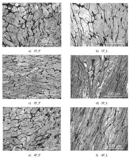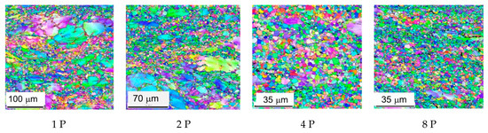 The microstructure and substructure features of the samples were characterized by a ZEISS light microscope and a ZEISS Auriga Compact scanning electron microscope (SEM)(Carl Zeiss, Jena, Germany) equipped with an EDAX electron back-scatter diffraction (EBSD) system. The samples for all the measurements were polished to a mirror-like quality using a diamond suspension of grade 3, 1, and 0.25 μm and an alumina suspension of grade 0.05 μm. Finally, the sample’s surface was ion-polished by a Leica EM RES102 device in order to get a high-quality surface for the EBSD measurements. The EBSD step size varied and depended on the analyzed scan size. It was selected to be 0.3 μm, 0.2 μm, 0.1 μm, and 0.1 μm for the 1P, 2P, 4P, and 8P samples, respectively. The samples intended for the light microscope were ground, polished, and finally etched for 2 s using an etchant for revealing the grain boundaries (20 ml of acetic acid, 3 g of picric acid, 20 ml of H2O3, and 50 ml of ethanol, 95%).