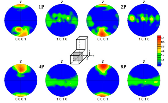 The cast alloy was considered to be texture-free and, therefore, the texture characterization was not performed. On the other hand, ECAP is known to cause strong texture formation. Figure 7 shows the EBSD pole figures calculated from the meaningfully large EBSD maps comprising a high number of grains. The results show that the texture formation was typical for ECAP route type A with only one texture element representing the grains with basal planes parallel to the processing direction and perpendicular to the feed-in direction denoted as Z [1]. This texture element was formed by the extensive activation of the twinning in the feed-in channel and the subsequent activation of the primarily <c + a> when the material passed through the sharp angle. This texture development is shown and discussed in detail elsewhere [1].