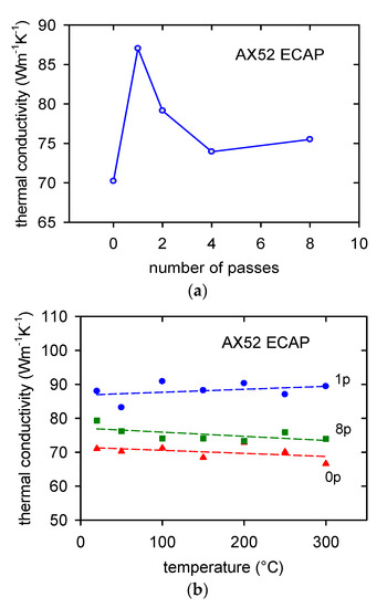 The thermal conductivity extrapolated to room temperature depending on the number of ECAP passes is shown in Figure 8a. The conductivity maximum was observed after the first ECAP pass, then the conductivity rapidly decreased. A small increase in the conductivity after the eighth pass was found. Generally, the thermal conductivity of magnesium alloys may depend on their composition, temperature, and thermomechanical treatment. The thermal conductivity may be affected by various microstructural factors such as the texture, grain size, precipitates, and dislocations [43]. In the ECAP AX52 alloy, all these influences may play a role; the microstructure and substructure of the samples were changed after the passes through the ECAP tool. The temperature dependencies of the thermal conductivity measured for the samples in the as-cast state and after the first and eighth passes are reported in Figure 8b. For clarity purposes only, straight lines are shown in Figure 8b, the dependences estimated for the other passes lie among them. As it can be easily seen, the temperature dependence of the thermal conductivity is linear, which complies with the Smith–Palmer equation.