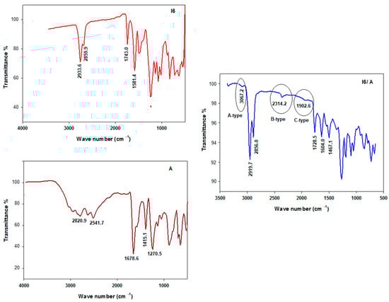 The formation of the H-bonding could be estimated with many spectroscopic tools such as NMR, single crystal X-ray diffraction analysis, and FT-IR spectroscopy [,,,]. Here, the FT-IR stretching comparisons were reported in the crystalline state at room temperature to give excellent evidence for H-bonding formation through the appearance of three new Fermi resonance vibration bands assigned to the H-bonded OH groups of the A-, B-, and C-types [,,,,,,,,]. FT-IR spectral data were recorded for the individual components, as well as for their supramolecular complexes; see Figure 1. The FT-IR spectra of I6 and A and their I6/A complex showed a band at 1728 cm−1 due to the C=O group of the ester moiety of the nicotinate group of the I6/A complex instead of 1743 cm−1 for its free base I6. The intermolecular dimeric H-bond of the carboxylic groups of the acids was replaced with that between the isophthalic acid (A) and the pyridine of the base (I6). Moreover, the A-type Fermi band of the I6/A complex lay between 3067 and 3081 cm−1. Furthermore, the peaks at 2452 (I6/A) and 2363 cm−1 (I6/B) were assigned to B-type of the in-plane bending vibration of the O–H group. On the other hand, bands at 1902 and 1910 cm−1 corresponded to the C-type Fermi band for I6/A and I6/B, respectively. This was ascribed to the interaction between the overtone of the torsional effect and the fundamental stretching vibration of the OH group.