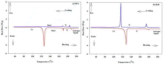 The mesomorphic activities of the individual components (I6) and their 2:1 supramolecular H-bonded systems (I6/A and I6/B) were investigated. The transition temperatures (T) and their associated enthalpy (∆H), as well as the normalized entropies (∆S/R) of mesophase transitions for the investigated base (phenyl nicotinate; I6) and its SMHBCs, as derived from DSC, are collected in Table 1. It should be mentioned here that, the nicotinate derivative I6 is purely nematogenic, as it only possesses the nematic phase, whereas the terephthalic and isophthalic acids are non-mesomorphic. Polarized optical microscopy (POM) textures of the analyzed I6/A and I6/B complexes are presented in Figure 2. In order to ensure the stability of the mixtures, the DSC measurements were performed for two heating–cooling cycles. All thermal analyses of these complexes were recorded from the second heating scan. DSC measurements were confirmed by the POM texture observations. As can be seen in Table 1 and Figure 2, the two prepared SMHBCs were mesomorphic, exhibiting high thermal activates with broad range of stabilities. The DSC thermograms, upon second heating/cooling cycles, of investigated I6/A and I6/B complexes are shown in Figure 3. As shown in Figure 3, enantiotropic mesophases (mesophases observed upon heating and cooling cycles) were observed for both the I6/A and I6/B SMHB complexes. The data revealed that the 2:1 SMHB complexes possessed melting transitions lower than the individual components, where the melting temperatures of the isophthalic and terephthalic acids were 342 and 300 °C, respectively. In case of the isophthalic complex (I6/A), all investigations revealed that it was dimorphic and exhibited the smectic A phase followed by the nematic phase, meaning that an induced Smectic A (SmA) phase with a relatively wide temperature range (~43.7 °C). The range in which the nematic phase was stable was lower than the Schiff base precursor (from 53.9 °C for I6 to 16.3 °C for complex I6/A and 52.7 for complex I6/B. Moreover, the N–I transition temperature was increased to 186.9 for I6/A. In the second system, I6/B, it was observed that the 2:1 complex was slightly less stable than its isomer I6/A. Thus, the shape and core of the H-donor molecule were found to be more effective on the stability of the observed N phase. It can be concluded that the increment of the molecular anisotropy influenced the nematic phases range and its stability, thus agreeing with previous reported work [] which stated that the increment of the mesogenic core length enhanced the nematic phase stability.