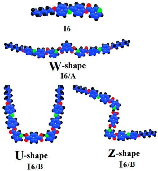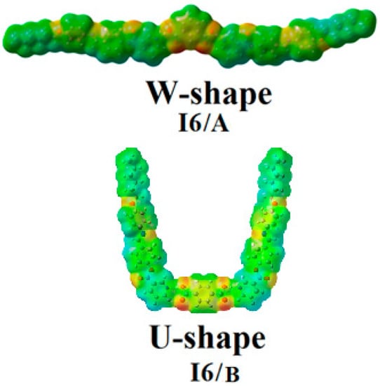 On the other hand, the estimated dipole moment was one of the most important explanations of the type and behavior of the formed mesophases. From Table 2, it is obvious that the predicted dipole moment of the U-shaped SMHBCs complexes was higher than its W-shaped isomer. The lower dipole moment of the W-shaped complexes could be rationalized in terms of its symmetry, as well as its linearity, compared with its I6/A isomer. However, the high dipole moment and high aspect ratio of I6 was good evidence for the nematic texture of the formed mesophase with a wide range. The higher dipole moment stabilized the interactive aggregation, thus enhancing the stability and the range of the mesophase.