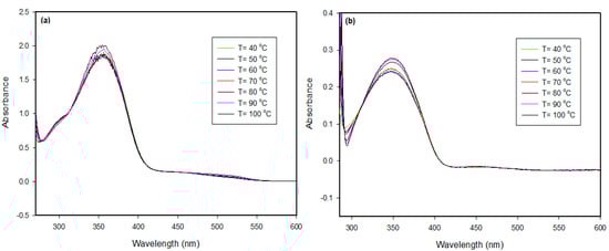 UV absorption spectrum of the I6/A supramolecular complex with a heating range from 40 to 100 °C (a) in the DMF solvent and (b) in the toluene solvent.
