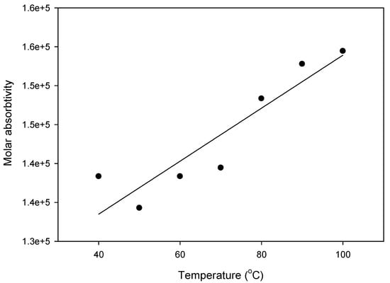 Photophysical studies of the isophthalic supramolecular complex (I6/A) were carried out by measuring UV–vis spectra in two different solvents with temperatures changes. The C = 1.8·10−6 mol/L of complex in Dimethyle formamide (DMF) or toluene solutions was used to record the spectrophotometric absorption spectra bands at a temperature range of 40–100 °C. Figure 7 indicates the graphical representation of the resulted photoisomerization absorption bands. As shown in Figure 7, the I6/A SMHBC in the DMF solution had two maximum absorption bands at ~356 and ~516 nm, while in toluene, its absorption bands shifted to ~348 and ~455 nm. The absorbance slightly increased with temperature. The intense electronic delocalization and π–π* transitions of the investigated complexes, due to the presence of Schiff base linkage, were recognized as the maximum absorption in the present H-bonding interactions. Moreover, the wavelength and intensity of the absorption peak were dependent on the chromophores and the degree of conjugation that affected the absorption of light at a given wavelength. The maximum absorption bands of these complexes could be attributed to the electronic transition from the HOMO to the LUMO. Moreover, the type of the solvent affected the degree of the solvation and the type of the intermolecular interaction, consequently affecting the magnitude of the absorbance at a certain wavelength. The molar absorptivity Ɛ in M−1 cm−1 at a given wavelength of maximum absorption was correlated as a function of temperature and is depicted in Figure 8. As can be seen in Figure 8, a linear dependency of the molar absorptivity was observed as an increment of temperature, such that it could be concluded that the shape of a given absorption peak is essentially determined by some characteristic parameters that may be evaluated from the observed spectrum at any one temperature [].