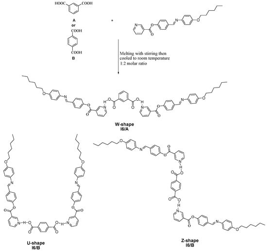 The supramolecular complexes I6/A and I6/B were formed from a 2:1 molar ratio of 4-(4-(hexyloxyphenyliminomethyl) phenyl nicotinate (I6) (Aldrich, Wisconsin, WI, USA) and individually with both isophthalic acid (A) and terephthalic acid (B). The solid mixtures of the two components were melted with stirring to form an intimate blend, which was then allowed to cool to room temperature (Scheme 1). The formation of SMHBCs confirmed via differential scanning calorimetry (DSC, New Castle, DE, USA) investigations and FT-IR spectroscopy (FTIR, Nicolet iS 10 Thermo Scientific, Waltham, MA, USA).