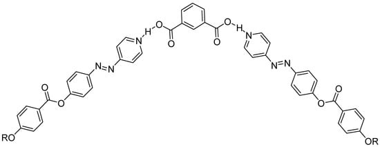 - laasar, M.; Tschierske, C.; Prehm, M. Hydrogen-bonded supramolecular complexes formed between isophthalic acid and pyridine-based derivatives. Liq. Cryst. 2011, 38, 925–934. [Google Scholar] [CrossRef]