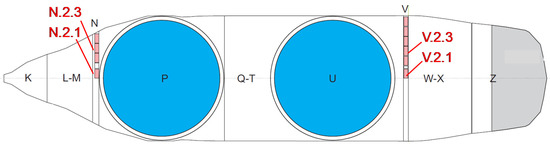 Float-zone crystal ingot Si28-33Pr11: schematic cross section. The measured samples (cubic shape with approx. 500 mg each) bracketing the sphere areas (P and U) are taken from parts N and V.