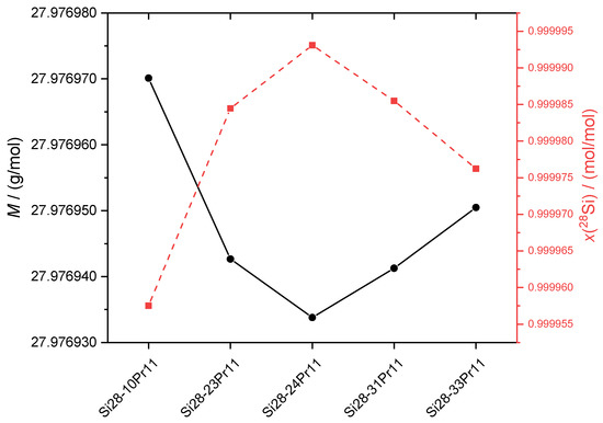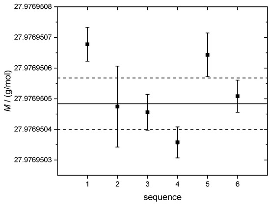 The error bars (uncertainties) of both M and x(28Si) are not shown in Figure 6, because of their comparable small range which is covered by the data points itself. On an absolute scale, the “abundance” of 29Si and 30Si is “tiny” yielding ranges of approximately 6 × 10−6 < x(29Si) < 4 × 10−5 mol/mol. The range of x(30Si) is lowered by up to two orders of magnitude: 2 × 10−7 < x(30Si) < 1 × 10−6 mol/mol. In fact, the measurement of the 30Si isotopes is challenging, and the more difficult, the smaller x(30Si). This experimental problem is not influencing the uncertainty associated with M because of the absence of any input values of amount-of-substances in the conditional equation of M given in [24].